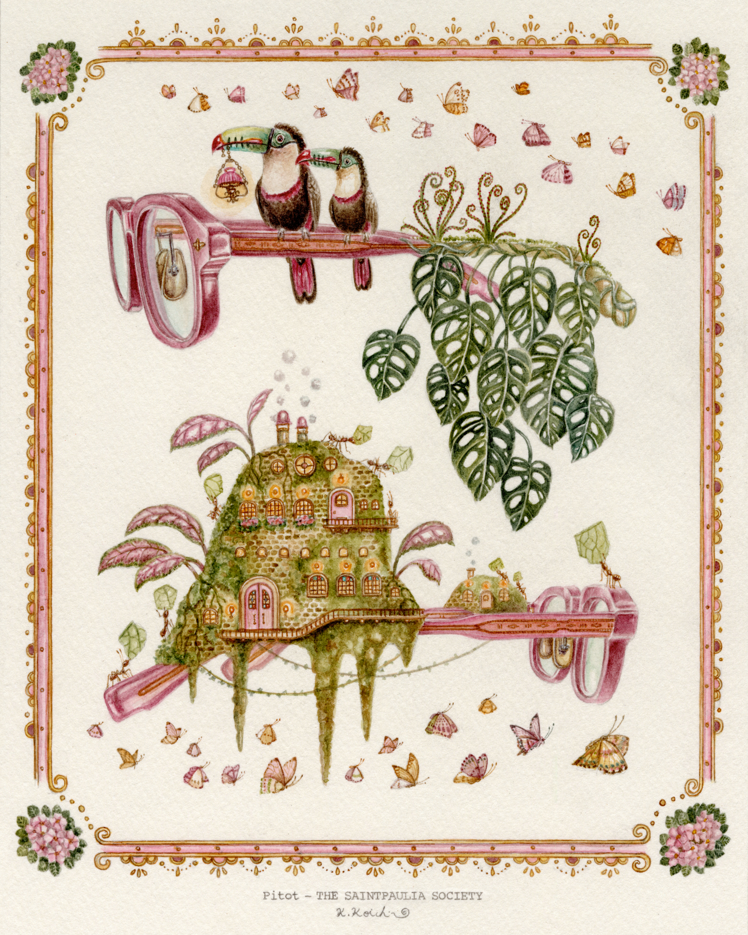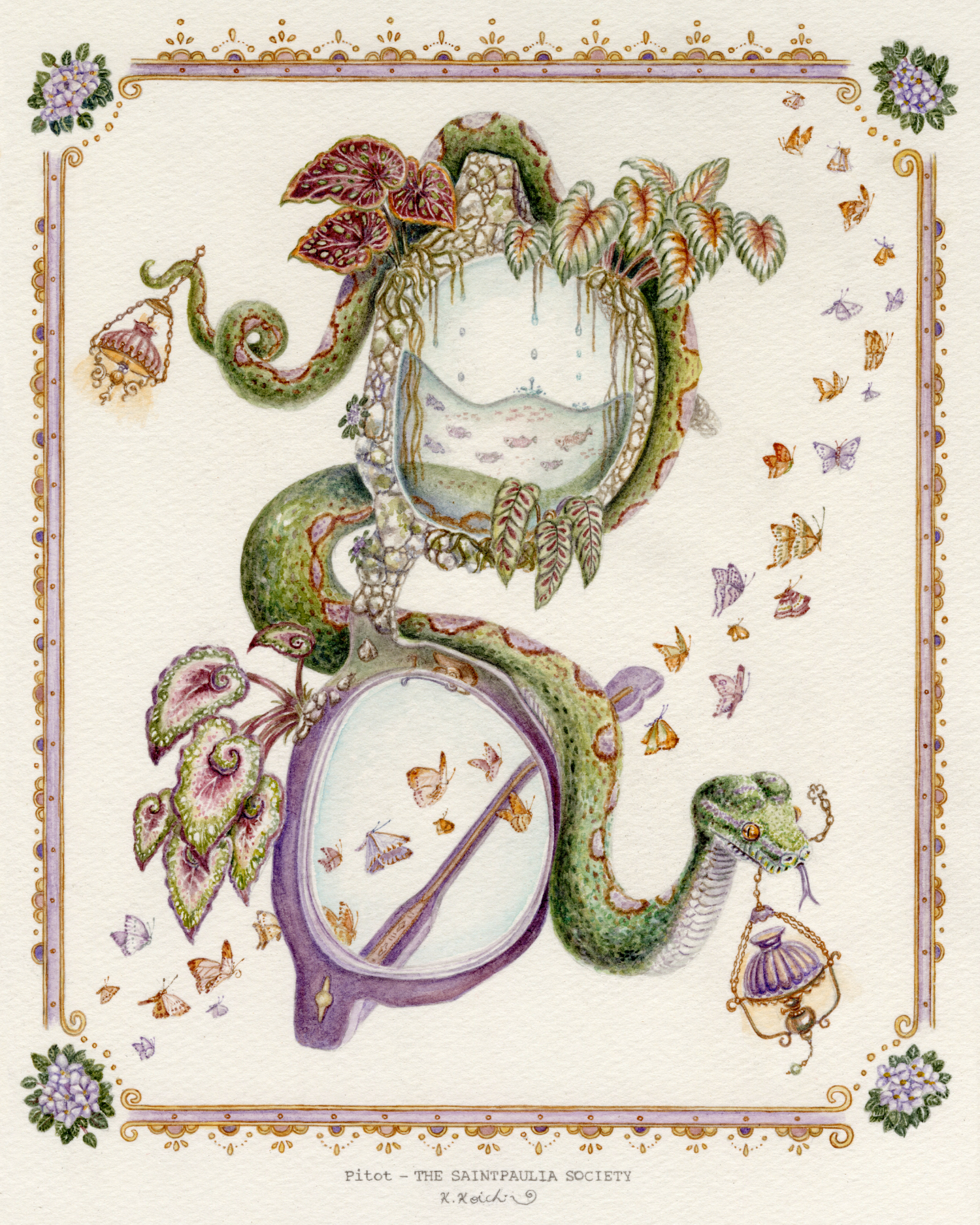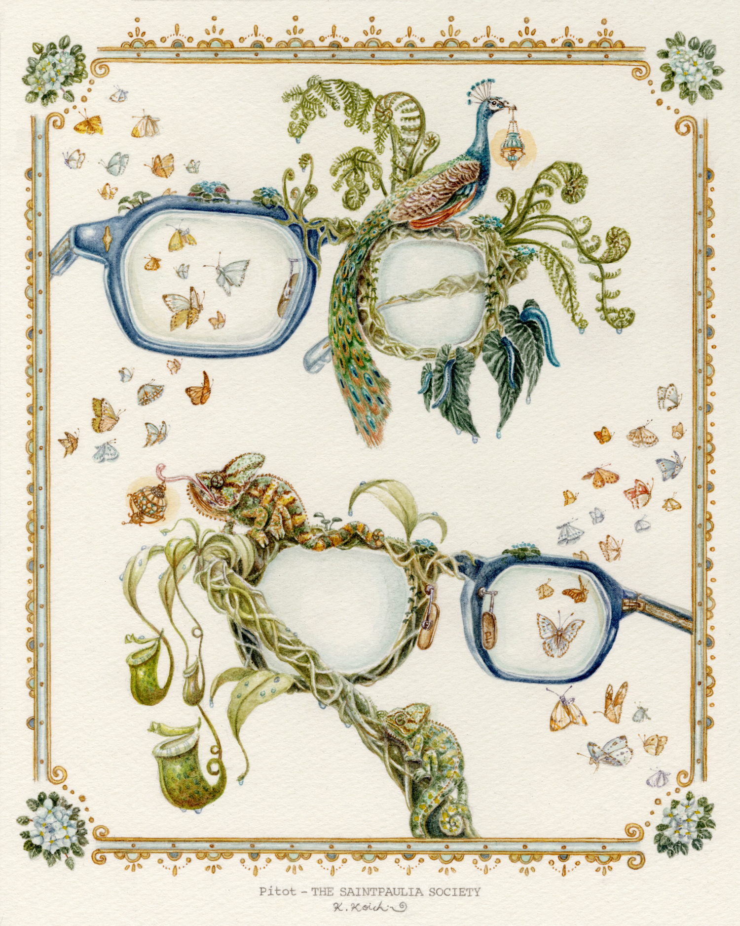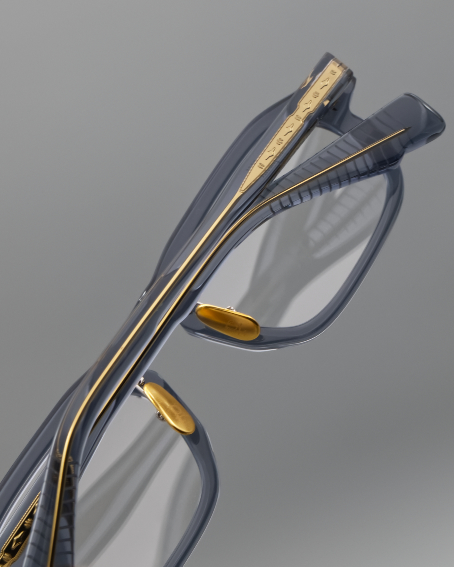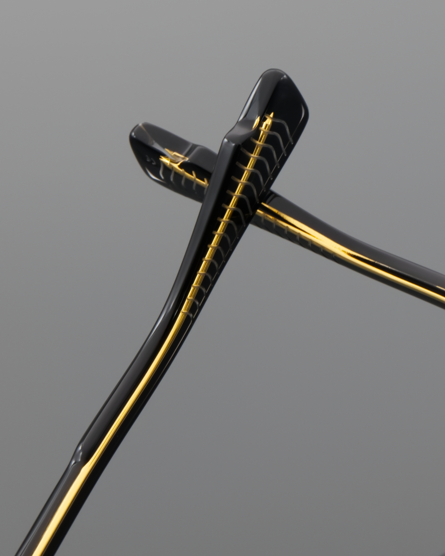テンプルに埋め込まれている金属芯に凹凸のある繊細な彫金を施し、細やかながらも目を惹くセントポーリアの花弁の様を表現した。また、テンプルエンドの厚みを持たせた模様・形状は、肉厚のある特徴的な葉ぶりから引用されている。